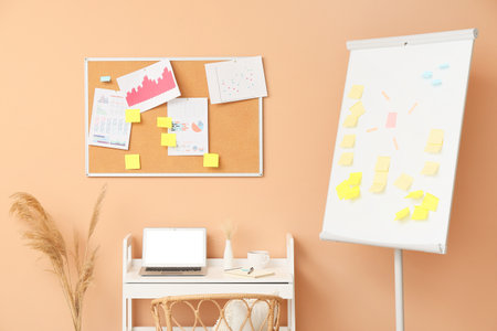 Modern workplace with sticky notes and flipchart near beige wall