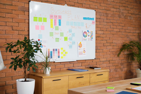 Whiteboard with business plan on brick wall in office