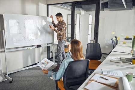 Young lecturer or scientist with an exposé on the whiteboard in a lecture