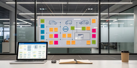 A modern office space features a collaborative project planning board filled with sticky notes, a laptop open with data, and a coffee cup on the desk, highlighting teamwork and productivity.