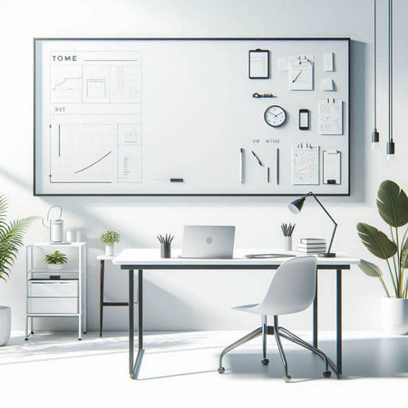 workplace with laptop and office supplies in office with white board