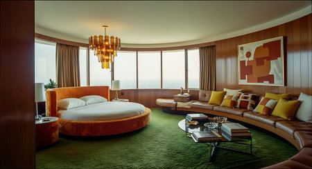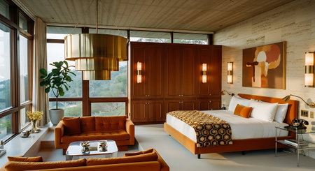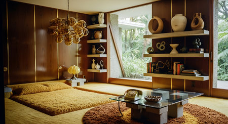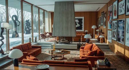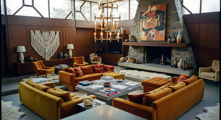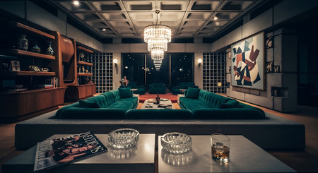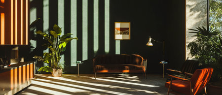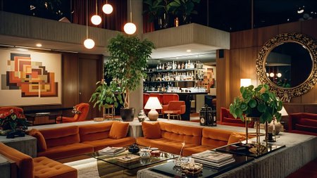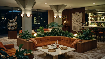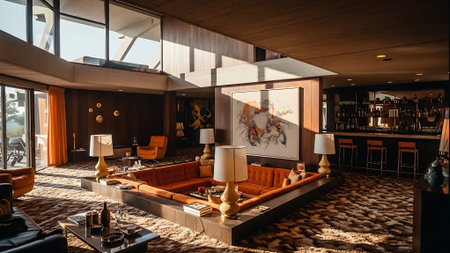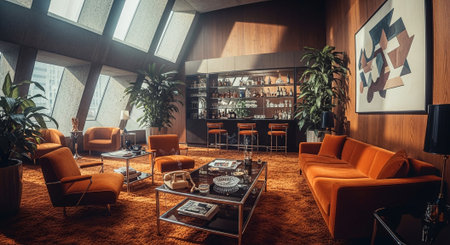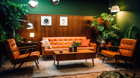 Inspiring office interior design Mid-century style Lounge featuring Retro elements architecture. Generative AI AIG 31.