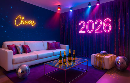 Illuminated living room decorated for upcoming new year celebration with glowing neon signs. A comfortable sofa is adorned with festive pillows, complemented by a glass coffee table holding champagne bottles. Disco balls are placed on floor, adding a reflective sparkle to the bright, colorful lighting creating an ambiance for joyful occasion.