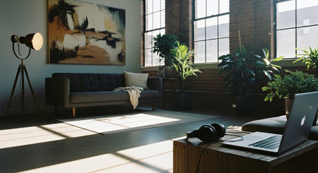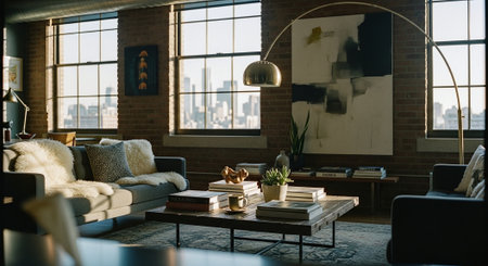 Cozy modern living room with natural light and greenery in urban setting during daytime. Generative AI