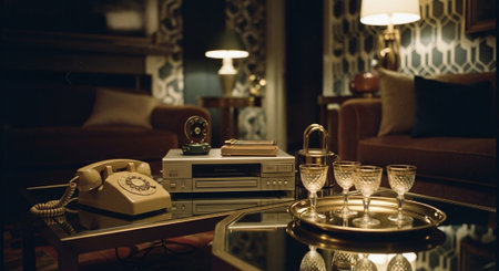 Luxury hotel room interior with vintage telephone and table lamp.
