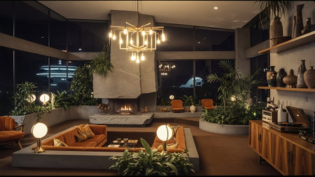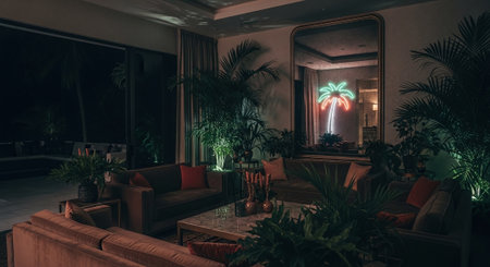 Modern living room interior with palm trees and plants. Night scene.