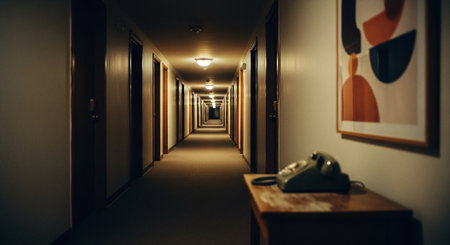 Interior of a hotel corridor with a telephone in the foreground.