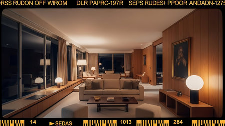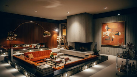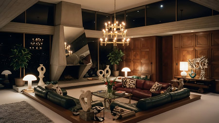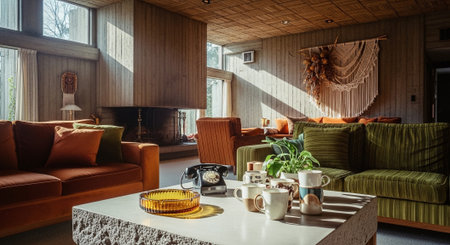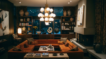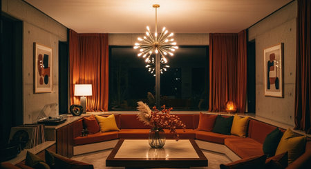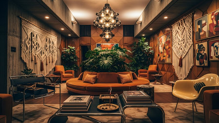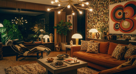 A stylish retro living room featuring a brown sofa, decorative pillows, a coffee table with art pieces, and a large plant, illuminated by unique light fixtures