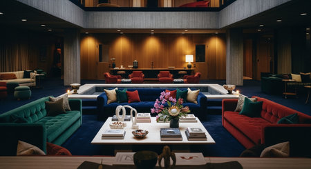 Interior of a luxury hotel lobby with coffee tables and sofas