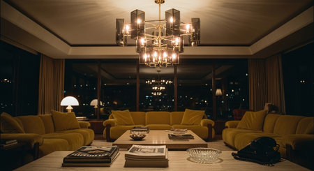 A modern living room with yellow sofas, a stylish chandelier, and large windows showing city lights at night