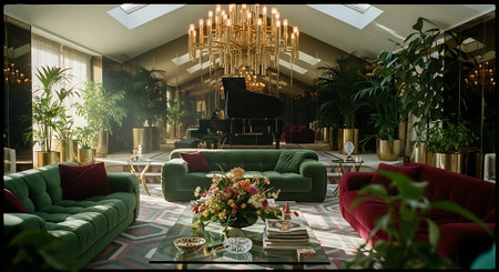 A stylish modern living room with colorful sofas, a central coffee table adorned with books and flowers, and a cozy atmosphere