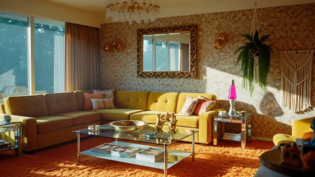Interior design of living room with mid-century modern style in green and yellow tone. Generative AI AIG27.