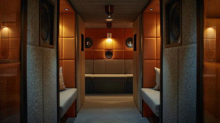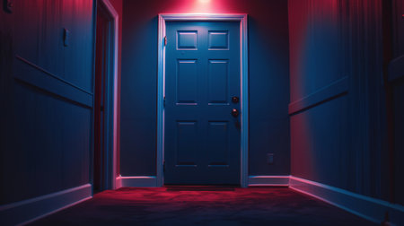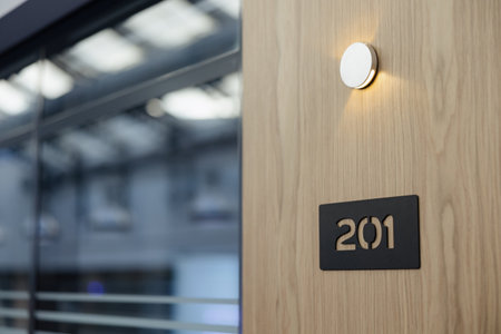 A stylish wooden door marked with number 201 features warm lighting, hinting at the comfort inside a welcoming area. The ambiance is inviting.