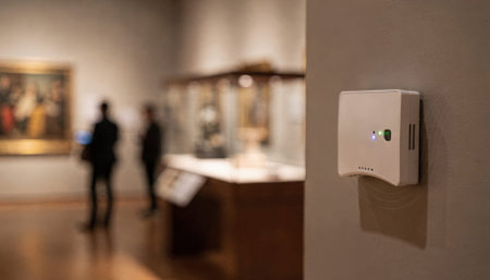 Focused environmental sensor mounted near an exhibit with soft bokeh effect on surrounding gallery space illustrating discreet realtime monitoring of temperature and humidity.