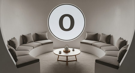 A modern, circular lounge area is designed with built-in, curved seating upholstered in neutral gray fabric. Plush cushions provide comfort. A low, round coffee table in the center holds a teapot and cups, suggesting a space for conversation or quiet contemplation. A prominent circular window with a large 'O' dominates the wall, bathing the space in soft light. The overall atmosphere is serene and contemporary.