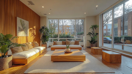 A cozy living room with modern decor, featuring large windows showcasing autumn foliage, stylish furniture, and decorative plants