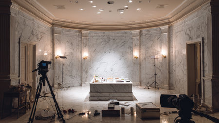A beautifully staged marble room featuring photography equipment and soft lighting, ideal for creative projects and artistic endeavors in an upscale environment.