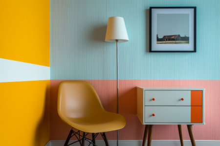 A stylish living room corner features a bright orange and blue wall, a sleek yellow chair, and a minimalist cabinet. Natural light enhances the inviting atmosphere, creating a warm ambiance.