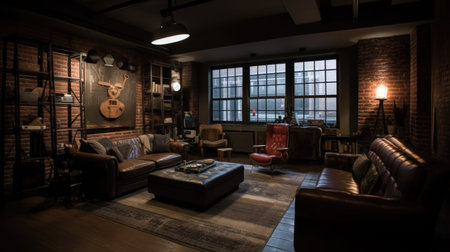 Interior design of Living Room in Industrial style with Brick Accent Wall decorated with Leather Sofa, Cowhide Rug material. Industrial architecture. Generative AI AIG24.