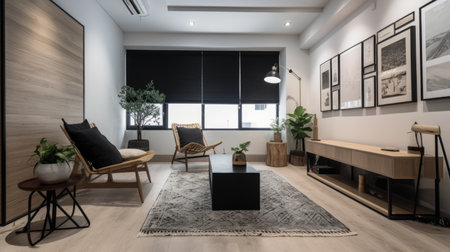 Living room decor, home interior design . Scandinavian Minimalist style with Wall Art decorated with Wood and Metal material . Generative AI AIG26.