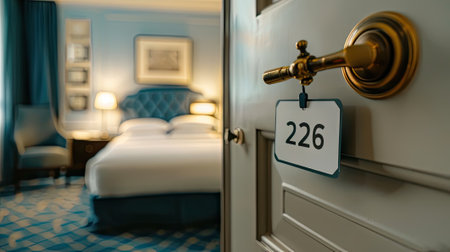 Luxury hotel room door hanger with hotel room luggage.