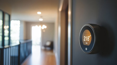 Smart thermostat glowing softly in night mode in a dimly lit hallway