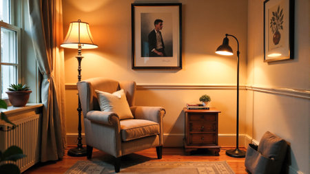 A warm living room corner features a plush armchair beside a lamp, a small wooden side table, and framed art on the walls, creating a welcoming atmosphere for relaxation.