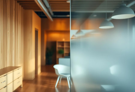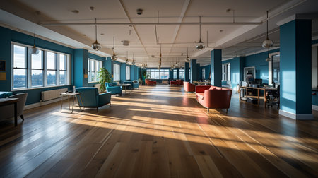 Modern office space at sunset with large windows, minimalist design, natural light, and sleek furniture for creative and professional environments