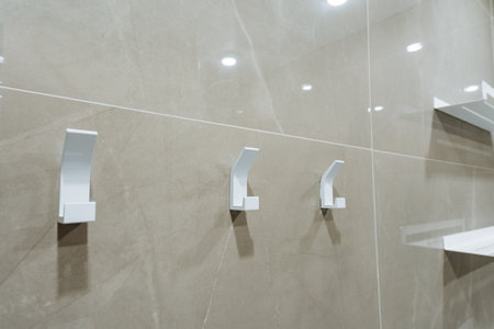Three elegant white hooks are mounted on a tiled wall in a modern bathroom, adding both functionality and a decorative touch to the design, which features high quality fixtures and tiles