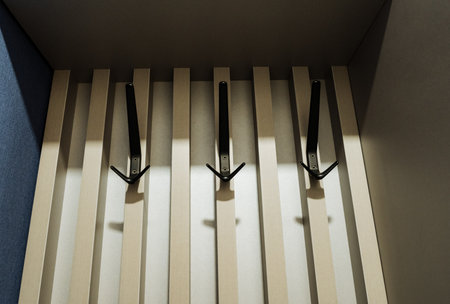 Minimal Modern Coat Hooks On Slatted Wall, Soft Warm Lighting, Matte Black Metal Hooks, Pale Wood Panels, Shadow Patterns, Clean Lines, Textured Grain, Calm Hygge Mood, Architectural Detail,