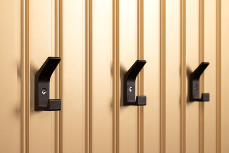 Black modern hangers, coat hooks on golden wall closeup. Selective focus