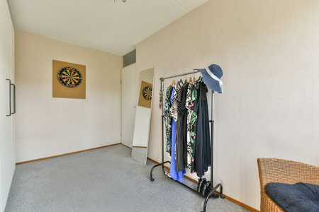 A contemporary interior scene featuring a clothing rack adorned with various outfits, a dartboard on the wall, and a cozy seating area. Perfect for fashion enthusiasts.