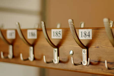 wardrobe, clothes hooks are numbered. coat rack with hooks for coats and jackets in a museum