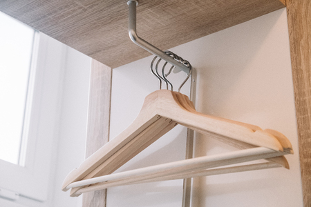 Empty clothes hanger. Wooden white hangers on white wooden wardrobe.
