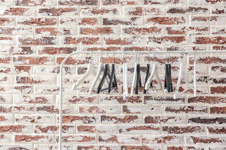Rack with clothes hangers against brick wall