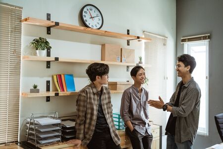 Photo of three friends laugh hang out weekend modern interior apartment indoors