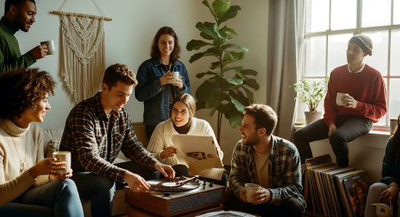 A group of friends enjoying a casual gathering in a cozy living room, with some holding mugs and others browsing vinyl records.