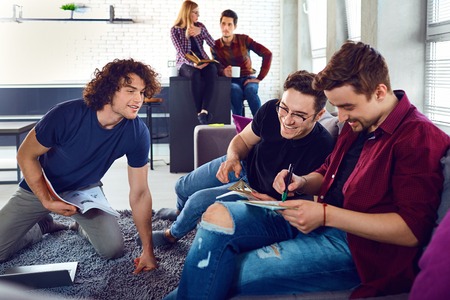 Smiling friends sitting at table and studying together. Two boys in casual clothes studying at home.