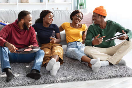 Diverse group of friends sitting on sofa in living room and listening to music.