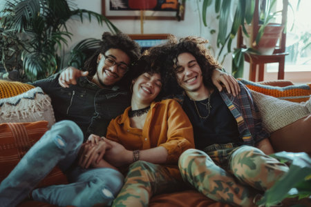 A polyamorous triad cuddling on a couch, their comfort and affection evident in a cozy, shared living space.