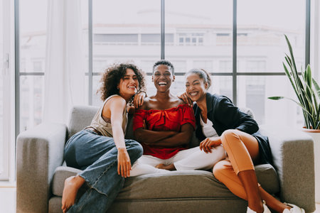 A diverse group of friends is seen smiling and embracing on a sofa inside. The scene features a cozy living room with natural light and neutral tones. The composition includes a balanced arrangement with a focus on connection and warmth. It is suitable for commercial use in lifestyle, social and relationship contexts.