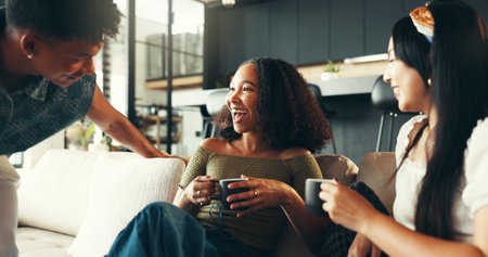 Bonding, laughing and friends with coffee, home and listening to gossip, couch and drinks in living room. Happy, conversation and relax in lounge, tea and together in weekend, talk or people in house