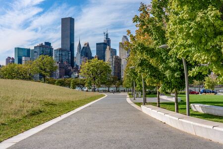 NEW YORK, USA - OCTOBER 13: Walking Path in Four Freedoms Park on Roosevelt Island with a view of Manhattan City buildings in the distance on October 13, 2019 in New York