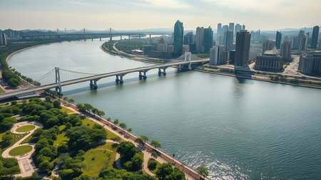 Aerial view of the skyscrapers and bridge over the river