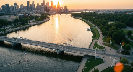 Serene city skyline reflected in tranquil river at sunset