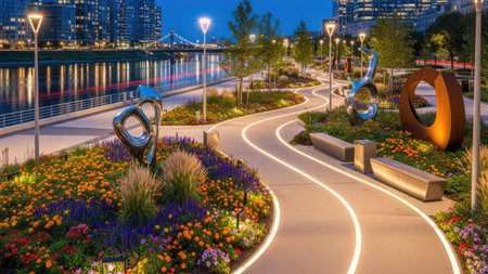 An evening view of a park featuring a curving pathway lit with integrated lights. Colorful flowerbeds flank the walkway, contrasting with neutral-toned benches and modern sculptures. The scene includes ambient lighting from lampposts. This image is suitable for a variety of editorial and commercial applications.