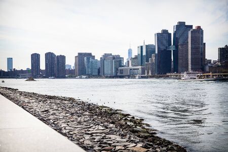 New York City waterfront skyline, Manhattan Midtown buildings, riverfront skyscrapers by East river water. Waterside cityscape, tower viewer, Gantry Plaza. Long Island, Queens. United States tourism.