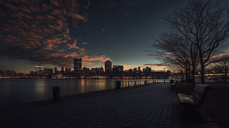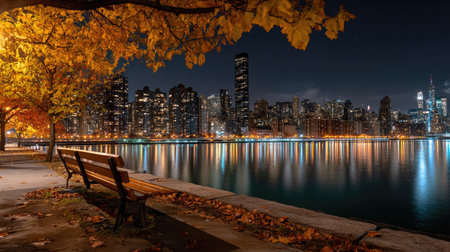 An evening landscape depicts a city skyline with tall buildings and their reflections in a body of water. The scene shows the waterfront with a bench under the amber-colored leaves of a tree. The lighting suggests dusk or night, with a tranquil atmosphere suitable for various visual projects.