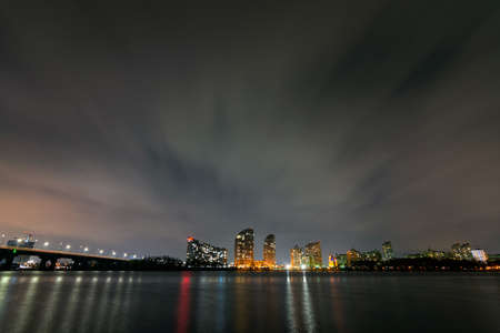 View of skyscrapers along the city river at night