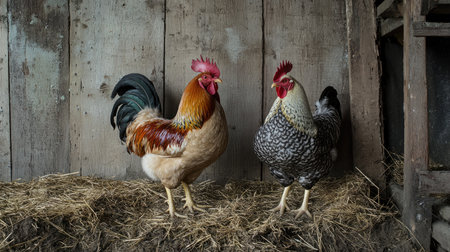 A vibrant rooster and a beautifully patterned hen stand on straw in a rustic barn setting. The weathered wood background adds charm to the serene farm life scene.